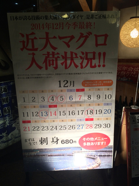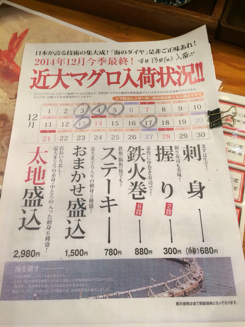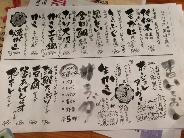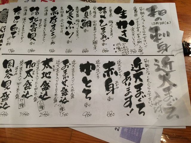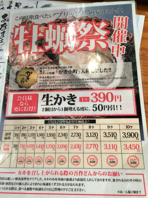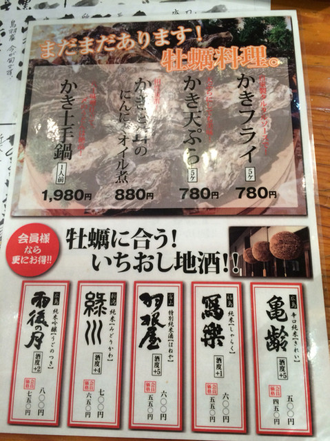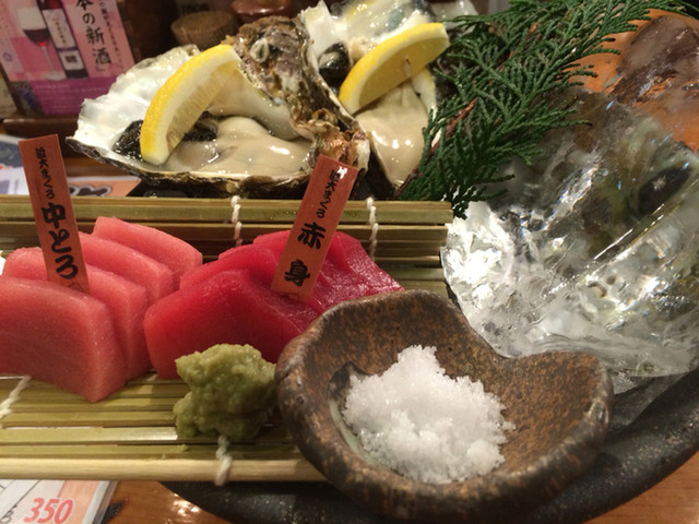 生かき2ヶ(¥780)→会員価格(¥730)・近大まぐろ中とろ(¥980)・近大まぐろ赤身(¥680)