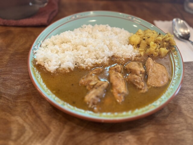 定番のチキンカレーに付け合わせはポテトのクミン炒めだ。このチキンとポテトがメチャクチャ美味くて、シャバシャバのルーに溶け込むような味だ。
