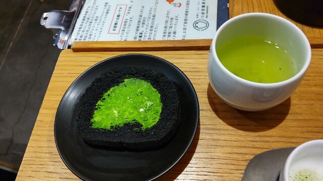 濃厚なのにしつこくない抹茶クリーム ロール部分は炭で真っ黒 皿が黒いので同化して見えない^^; 玉露と共に
