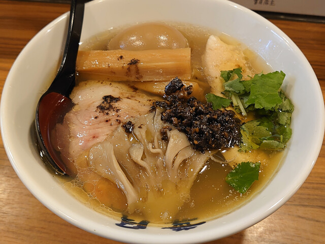 お店の定番である豚骨魚介系スープに鰹オイルがかけられています。このベースがしっかりしているからこそ、