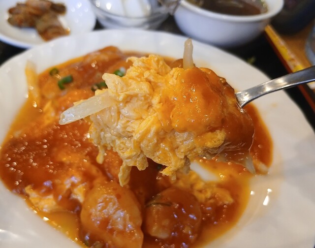 エビチリと玉子炒めは別々と思ったが、玉子炒めにエビチリぶっ掛けタイプ!