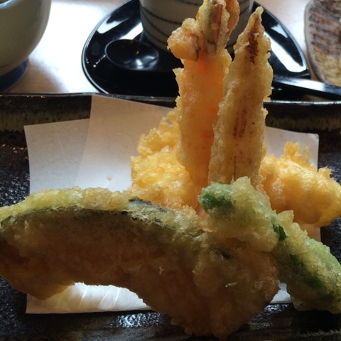 お寿司5カン、小鉢、茶碗蒸し、茶蕎麦、蟹サラダ、天ぷら、汁物、デザートのモリモリコースです(≧∇≦)