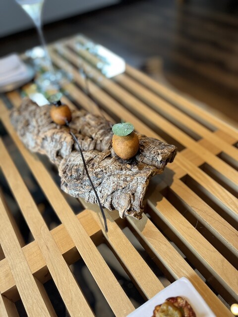 緑に見えるのはセロリのパウダー。紅い実はまたたびのピクルス。ワイルドな猪の旨みにセロリの香りがふわりと揺蕩う。そしてまたたびのジューシーな酸味。ここで口内にはしみじみ旨さを感じるアンテナが立つ。