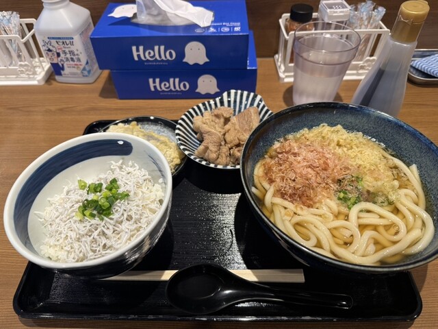 シラス丼は最後に鰹節をふりかけ、さらにうどんの汁を掛けて頂きました。