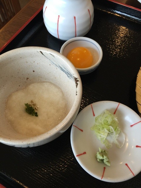 早速、とろろに卵黄を入れまして、丁寧なねぎとわさび、つゆを混ぜて頂きます。