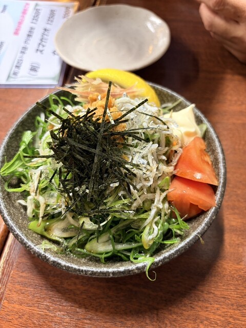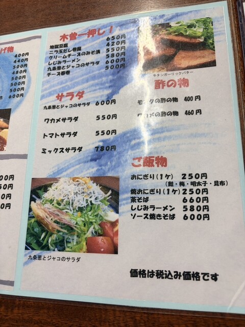 食べ物は、一押しの地獄豆腐、ニラ玉だし巻き風、ホッケ、九条ネギとジャコのサラダなど、締めにおにぎりをいただいてフィニッシュ!