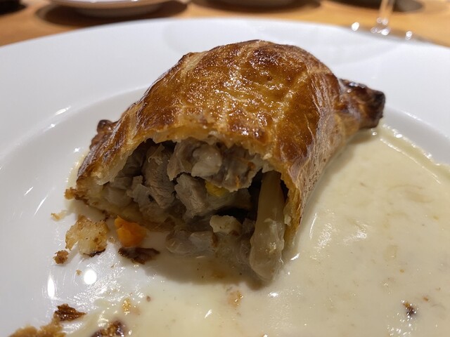 パイ生地はナイフできれいに切れる。フィリングは塩味の軟らかいラム、香茸と野菜。