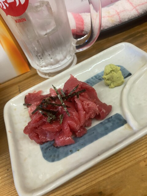 肴は、とりあえずのスパサラ(150円)。開店直後にある魚のうちブリカマ焼き(小・200円)