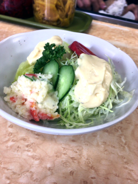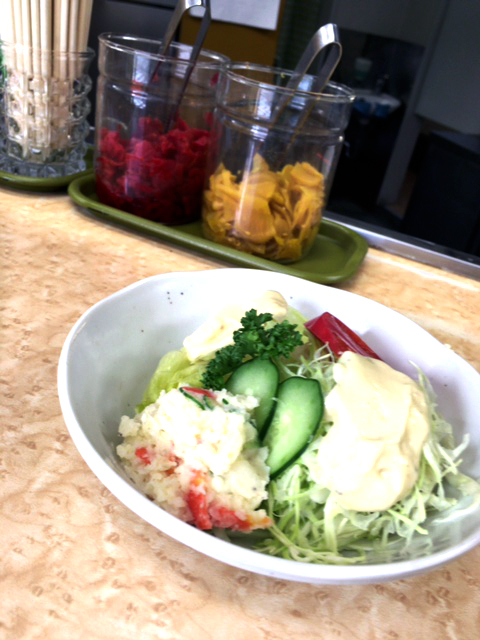 オーダーして12秒でサラダが出される。キャベ千、ポテサラ、レタス、トマトにパセリが載り、マヨネーズが添えられる。キャベ千もここまで細く丁寧に切られると美しい。