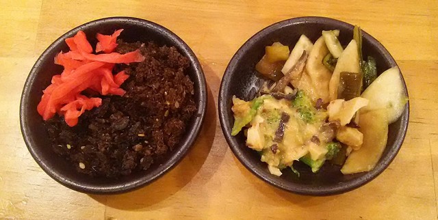 無料の薬味(辛もやし、昆布おかかの佃煮、漬物等)が