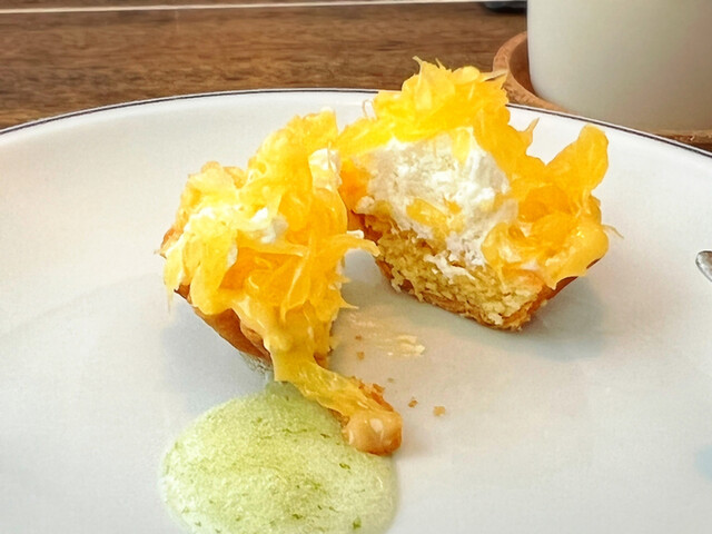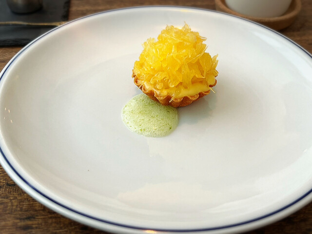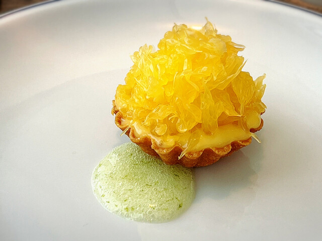 レモンのタルトの上にヨーグルトを乗せ、ハッサクの果実をペタペタと貼り付けたタルト。
