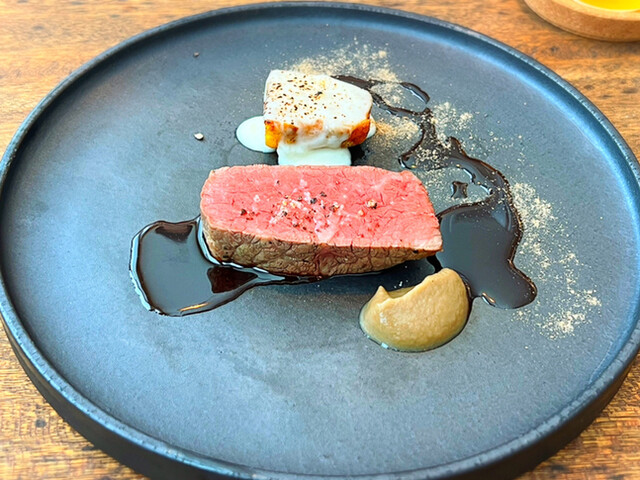 添えられているのは、牛蒡のピューレと安納芋のローストにグリュイエールチーズをたっぷりかけてバーナーで炙ったもの。