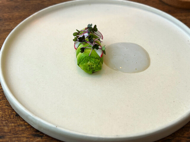 上には、ラディッシュと赤キャベツの芽を、ソースは山うどを使ったソースが添えられています。
