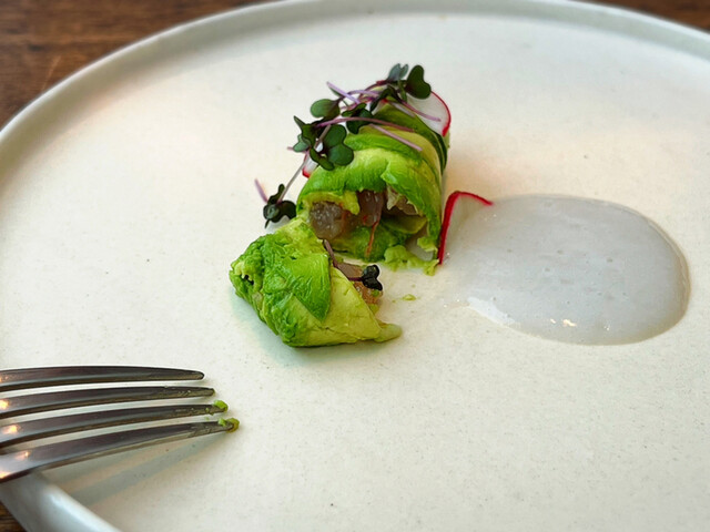 シェフの技術の凄さを感じるアボカドのスライスに包まれた甘海老は、甘味が強く美味しいです。