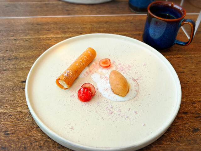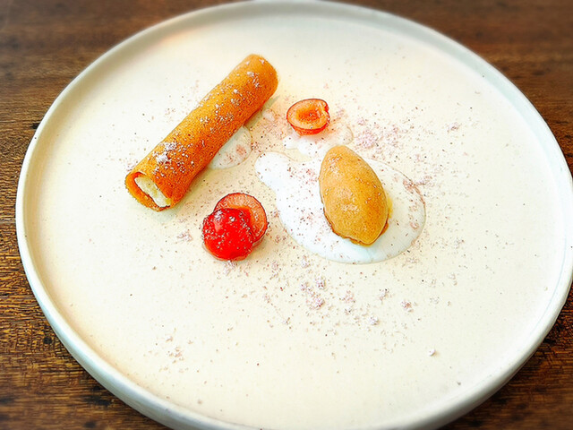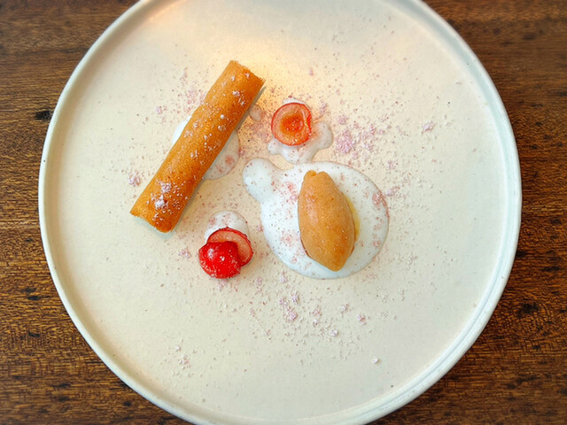 メインは、お米、バニラビーンズ、牛乳を柔らかくしたものをアーモンドチュイルで包んだものです。