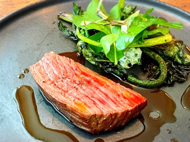 付け合わせのお野菜は、ルッコラ、菜の花を素揚げ、茹で、焼きと3種の調理法でグラデーションを作り綺麗に盛られています。