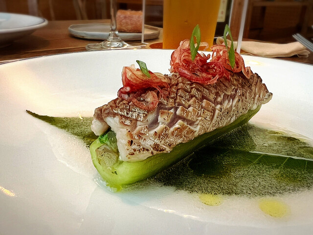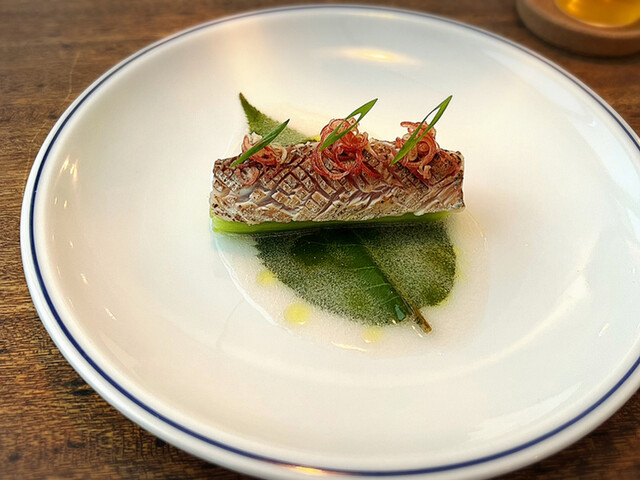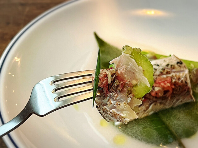 きゅうりと鯵の端材、オクラを叩いて作ったタルタルが、きゅうりのワタをくり抜いた部分に入っていて、その上にバーナーで炙った鯵がのっています。