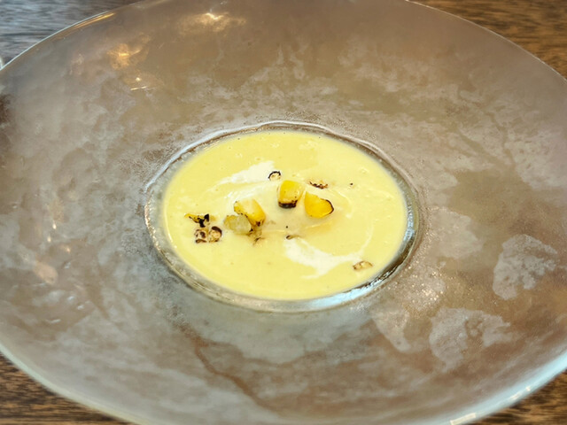 底にはコンソメジュレが敷いてあり、その上にとうもろこしのポタージュが入っています。