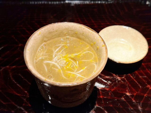 そのままでもカラスミの塩味と風味が美味しいですが、よもぎのお出汁につけていただくと、よもぎ餅のようか風味に変わり、より美味しいです。