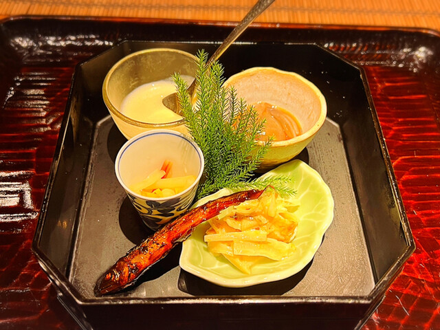 箸休め兼お魚のアテ 新玉ねぎの擦り流し ホタルイカの沖漬け はまぼうふの酢漬け うどとイカの蕗味噌 小鮎の甘露煮