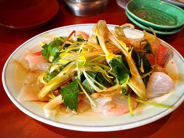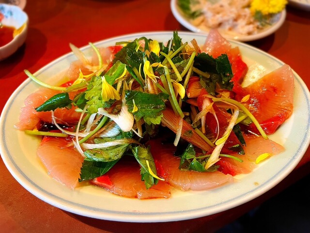 脂の乗ったカンパチと玉ねぎや茗荷の爽やかな香味野菜がよく合います。