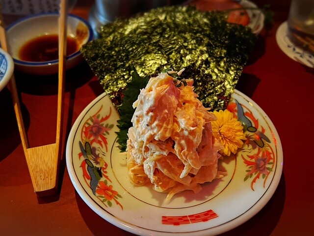 スライスされた玉ねぎとツナ、らっきょうが和えられたものを海苔に包んでいただきます。