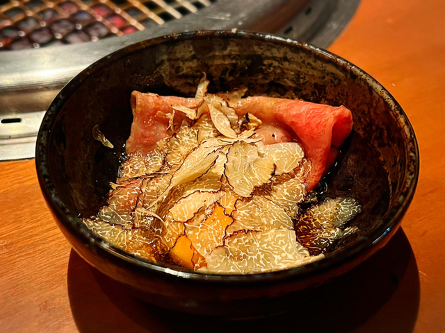 お肉で卵黄を泡立てるまで混ぜて、たっぷりのトリュフと絡めていただきます。