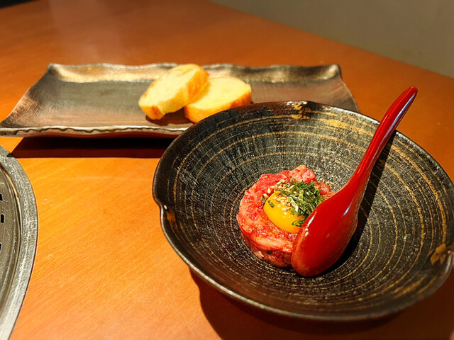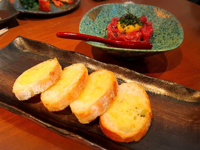 ユッケは、軽く炙ったバターたっぷりのフランスパンに乗せていただきます。