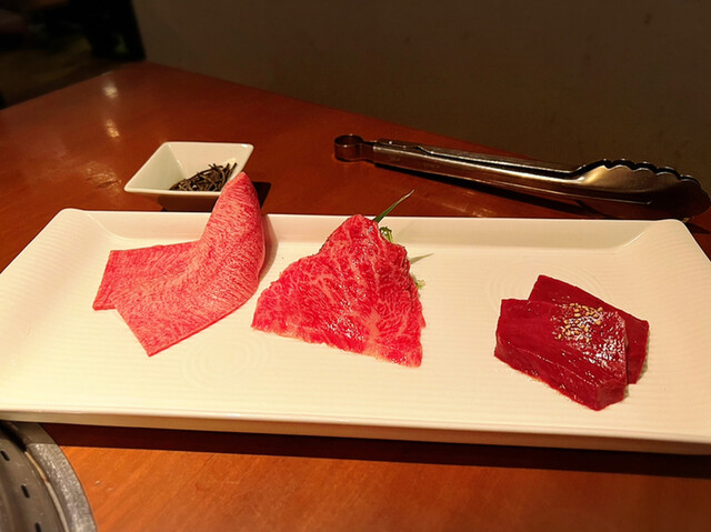 今回は、5000円の肉盛合せコースと肉刺身盛合せ(赤身・霜降り・ユッケ)をオーダー。