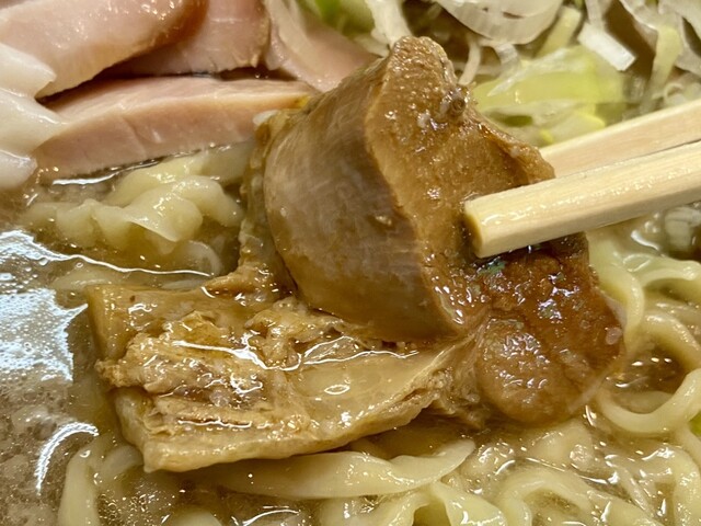 麺はいつもより手揉み強めの、低加水平打ち縮れ太麺。カタメの茹で加減で口中でブリブリ暴れます。強い脂と強い塩味に対抗出来るのは、こんな麺なんでしょうね。