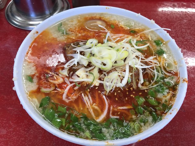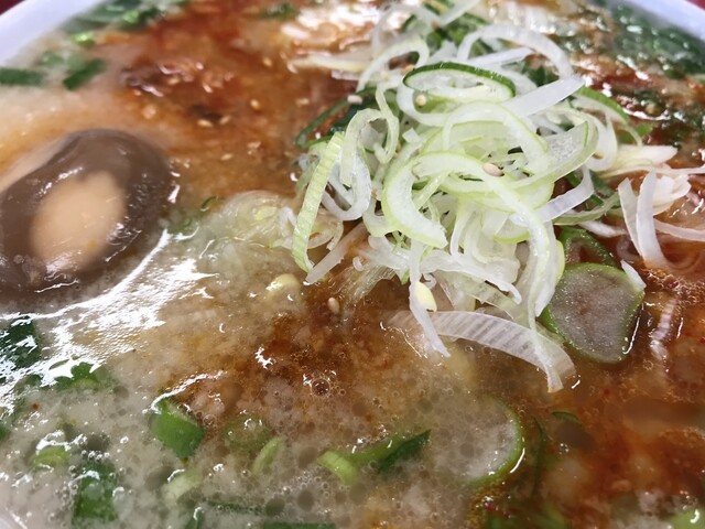 スープは豚骨ベースに、ギトギトの背脂がたっぷり乗った辛いやつ。スープ一口飲んだ瞬間のパンチ力には背徳感満点。このスープだけで、白ご飯一杯完食出来ちゃうぐらいの濃厚スープ(笑)