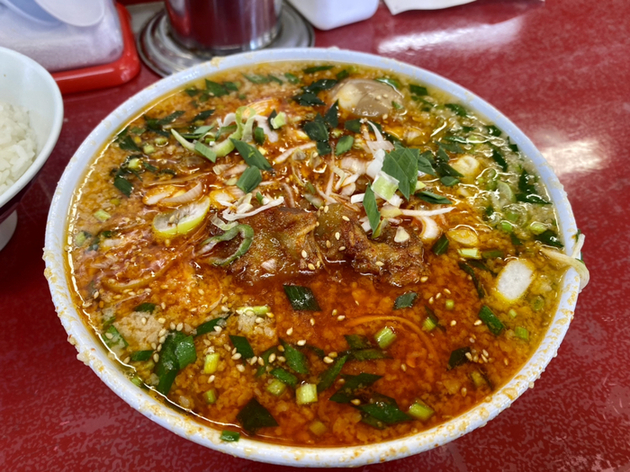 丼に、並々と注がれた真っ赤なスープが、インパクト充分。スープが溢れそうです。ラーメンというより鍋みたいなビジュアルです。