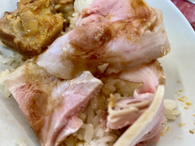 何故かこの日はサービスで「おつまみチャーシュー」をサービスで頂きました。ピンクレアで、柔らかくて美味しいです。それも乗せて、即席の肉まみれ丼の完成。残った濃厚オイリースープをかけると絶品です。