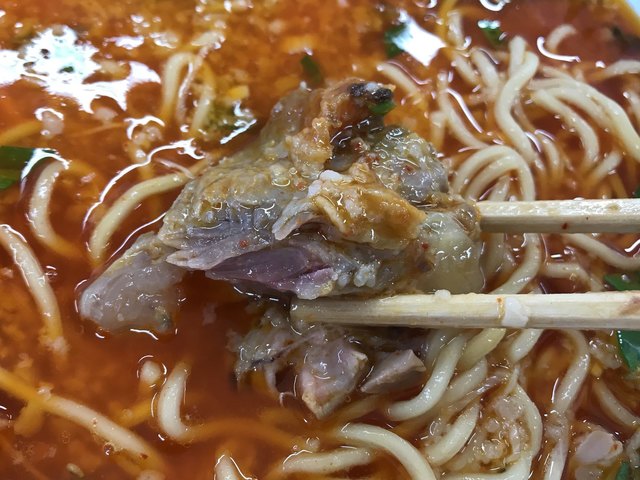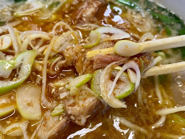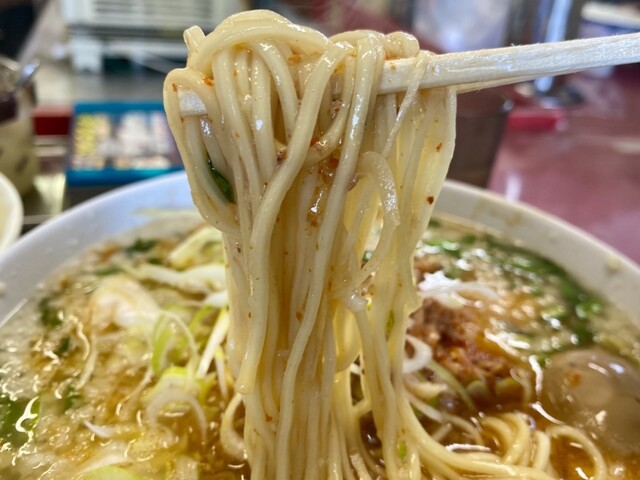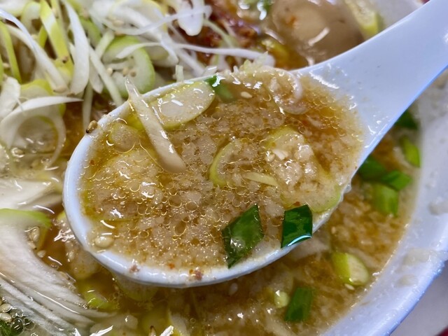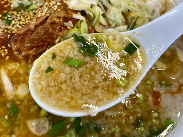 肉の旨味が全て溶け込んだ様な、こってりした濃厚スープには、ニンニク、生姜、ネギなどの香味野菜もたっぷり入ってます。パンチあります。辛味はそれほどでも無いんですが、物足りなさは全く無し。逆にレンゲを持つ手が止まりません。めちゃ美味いスープです。