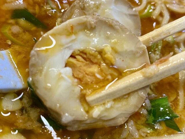 具材はこちらの名物「珍味辛口ホルモン」がドサっと乗ってます。このホルモンがトロトロで口中で溶けちゃうほどの美味。辣油もたっぷり絡んでますが、スープの旨味と背脂の甘味が勝ってますから辛くならないっていうのが面白い(笑)