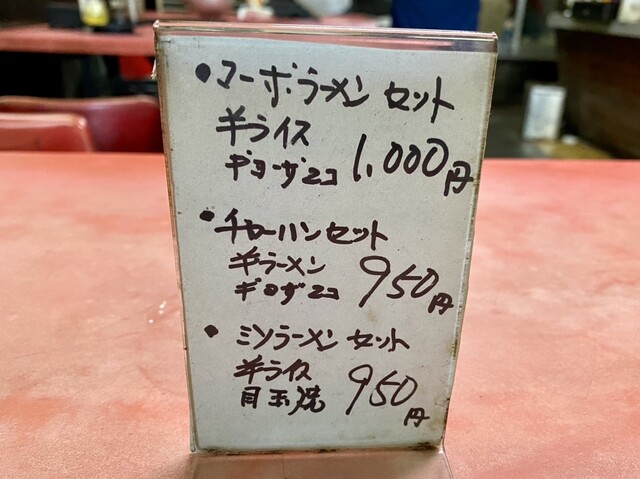 一番オススメっぽい、「マーボーラーメン」に、餃子2個と、半ライスの付いたセットを注文します。