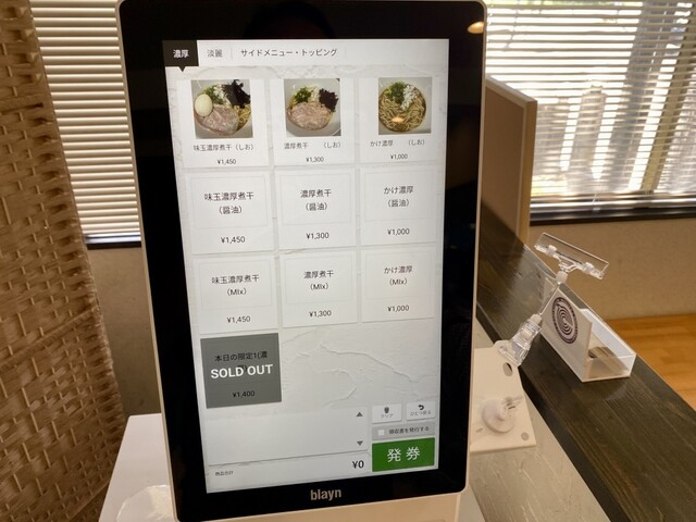 入店するとハイテク液晶券売機。ド煮干を味わうんだったらやっぱり「かけ濃厚」でしょ。味は醤油+塩の「MIX」を購入します。「かけ」のみだから「かえ玉」も購入しました。「かけ」で1,000円はけっこう攻めてますね。