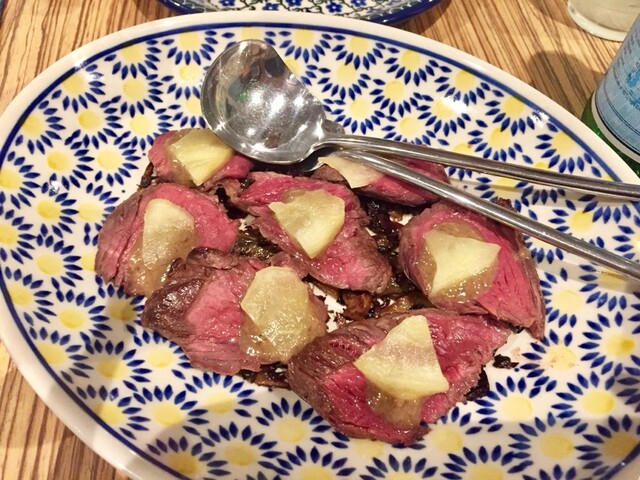 ハラミのローストは、シンプルな塩で焼いてあるやつですが、リンゴのコンポートとアンチョビソースが合わせてあって、下には苦味のあるエンダイブ。う、憎い、この組合せ。