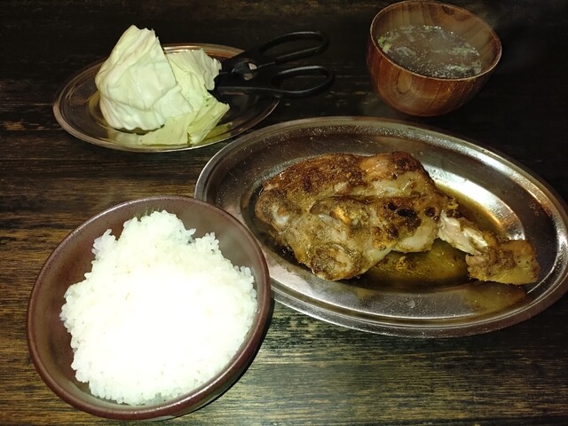 内容は、骨付きのモモ肉と、ご飯、お吸い物、キャベツです。