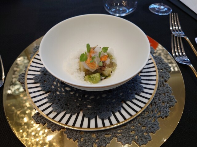前菜二品目はナスとイカとウニにシャーベットをかけたもの。夏にはこういう冷製の前菜がいいですね。