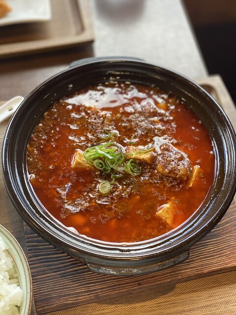 熱々の土鍋にぐつぐつ状態でやってくる麻婆豆腐。