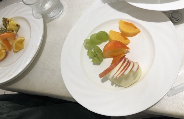 そして、フルーツ食べ放題。飾り切りのフルーツが美しい。一度の注文で4種類のフルーツとパフェが選べます。特に桃と、紫色のブドウが美味しかったです。