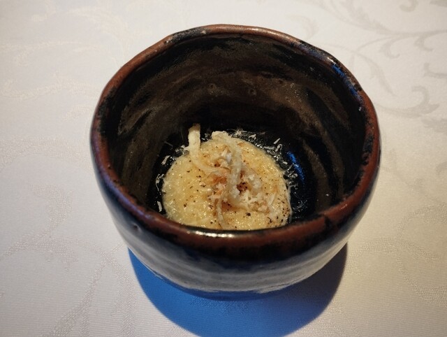 最初に、淡路島産 玉葱 トリュフ ズッパですね。これは名前の通り、淡路島県産の新タマネギを使ったスープ。トップにはタマネギのフリットと白トリュフオイル、そして、ペコリーノロマーノがかけられているそうです。正直なところ、タマネギの風味が割としっかりしているのと、ペコリーノロマーノの風味があるので、白トリュフオイルの風味はそんなに感じなかったかな。もっとも、タマネギスープとしては、濃厚で、旨みもあり、美味しいものでした。