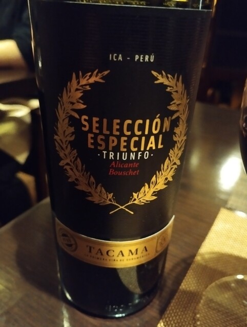 色的には黒系果実の方向でしょうか。カシスやブラックベリーのほか、多少熟成感を感じるようなドライフルーツやジャミ―な印象もあります。多少のスパイス感もあるかな。果実味がしっかりとあって、何となく温暖産地よりな印象です。イメージ的にはスペイン品種のグルナッシュみたいな味がしました。結構、タンニンもしっかりあって、余韻もほどほど。先がすぼまっていないボルドーグラスで提供されていましたが、合ってそうな感じでした。アリカンテブーシェというブドウを飲んだのは初めてだったのですが、本で調べたところ、プティ・ブーシェとグルナッシュの交配種らしいです。そういう意味ではあながち私のテイスティングも遠からずだったなと自信を深めました(気持的に)。アルコール度数は、13.5%で結構しっかりめだと思います。思ってたよりもずっと美味しいワインでした。ネットで見ると、1本3000円くらいみたいです。タカマワイナリーは南米最古のワイナリーかつペルー最大級のワイナリーらしいです。