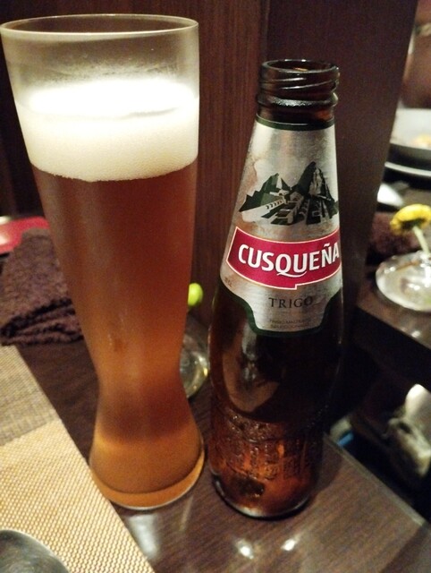 をお願いしました。これはペルーの有名なビールらしい。それほどそこらへんの店に出回っているって印象はないか。これは小麦を使った白ビールですね。ヴァイツェンとかと同じ方向性でしょうか。軽めでフルーティーな感じの味わいだと思います。私は、比較的白ビールが好きなのでこれをチョイス。1瓶330mlでアルコール度数は4.8%とかだったかな。軽いと思います。クスケーニャは、クスコの娘、トリゴは小麦の意味です。瓶の表面下の方がゴツゴツしていますが、これは世界遺産クスコの石垣をイメージしているそうです。ほうほう。