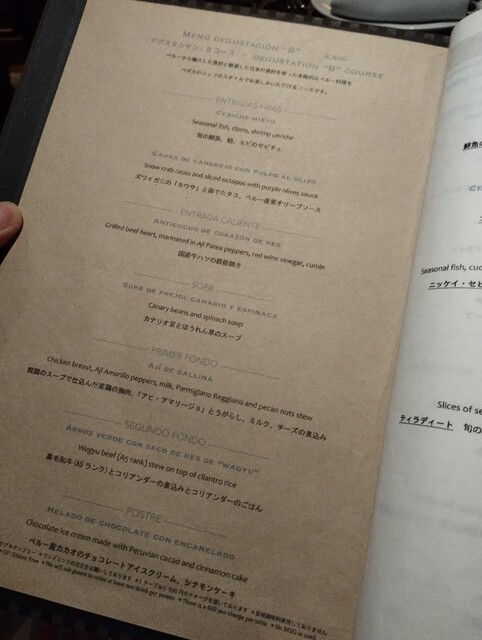 さて、我々の頼んだ、デグスタシオンAコースですが、これその物は何が出てくるのか予約の時点では分かってなかったのですが、ペルーから輸入した食材と厳選した日本の食材を使った本格的なペルー料理をベポカのシェフのスタイルでお楽しみいただけるスタンダードなコースと書かれていました。コースの内容は以下のとおり。