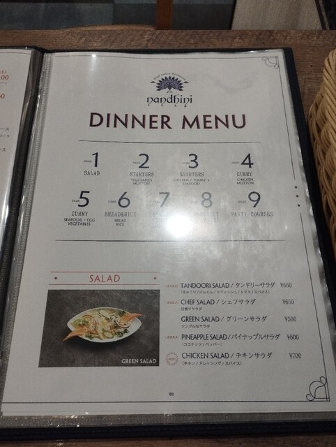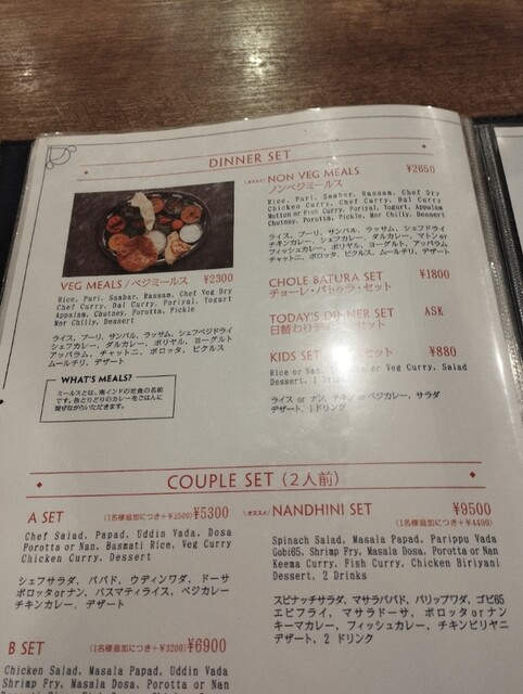 さて、ナンディニは基本的には南インド料理系のお店なので、ミールスやビリヤニが名物のようです。メニューをパラパラ見ると結構、メニューがあります。時折、アラカルトも頼むことがありますが、ミールスやビリヤニは食べたことがあるので、頼んだことがないディナーセットなるものをオーダーしてみることに。