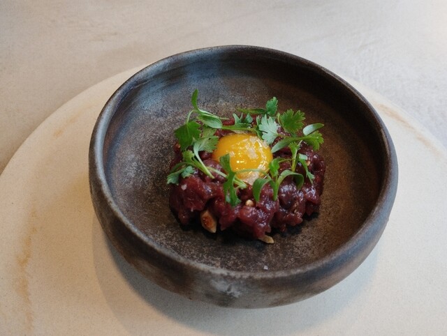 前菜1は、カンガルーのタルタルでした。実を言うと、数日前にカンガルーの肉を別のお店で偶然にも食べていたのですが、それは焼いてたので今回は趣向を変えてタルタル♪おぉー。さっぱりとしてユッケのような感じでしょうか。結構、さっぱりした脂少なめな健康肉(笑)という感じですね。ウズラ?の卵黄やパクチーなども載っておりエスニック調?私も、オーストラリアで英語の勉強していたこともあり(初めて行った海外もオーストラリアでした。)、ちょっとオーストラリアにはシンパシーを感じます。現地では人気のお料理らしいですが、まぁ、遠い昔の19歳、20歳の頃の話なので、そんなもんは現地で食ってません(笑)。初めて食べました。オーストラリア料理というと、渋谷の「アロッサ」さんなどが有名なのかな?あちらはちょっと変わってて、渋谷はオーストラリア料理、銀座の「アロッサ」さんはNZ料理の方に振っていたような気がします。銀座の方しか行ったことはありませんが。