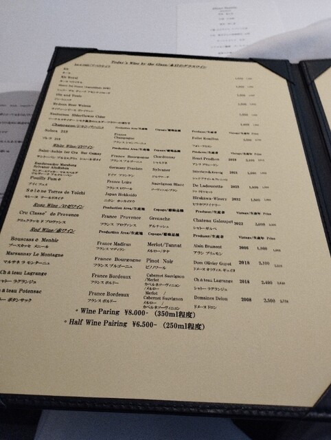 ワインは例によって、白、白、赤の3杯だけの健全スタイル(笑)。当日のコース料理のラインナップは紙のメニューで示されているので、ワインの選択にも役立ちます。もちろん、ソムリエの方もいるので、相談してみるのも良いかと。選んだのはこちら。