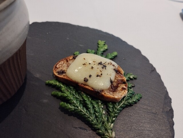 お料理は最初に、アミューズブーシュ(青森新牛蒡)ですね。これは季節の野菜のポタージュみたい。青森県から届いた新牛蒡を使った冷静ポタージュでした。隣のチーズは18か月熟成のコンテチーズを添えたトースト。牛蒡のポタージュってのがまた味わいが深くていいですね。私は、牛蒡の旬は秋から冬なのかな?と勝手に思っていたのですが、牛蒡には旬が2回あるらしく、初夏の時期の新牛蒡も旬で、この時期の牛蒡は柔らかく、灰汁が少なく香りも良いそうです。素材の旨みと香りがしっかり出ている一方で、嫌なざらつき感などはなく、丁寧な仕事をされているなぁという印象。最近は、どことは言いませんけど、割とはっきりした分かりやすい味のフレンチも結構多いですが、こちらのポタージュは、塩味はそう多くなく、塩味で食べさせるというよりは素材その物の味を大切にしている印象を受けました。コンテチーズはフランスで最もポピュラーなチーズですかね。私はかなりコンテチーズが好きで、自宅でも熟成違いを複数冷蔵庫にストックしていて、ワインのつまみにしていますが、こうやって炙ってみるのもいいですね。バゲットもカットして冷凍してあるので、今度、試してみようかな(笑)。ブラックペッパーがピリっとアクセントになっています。